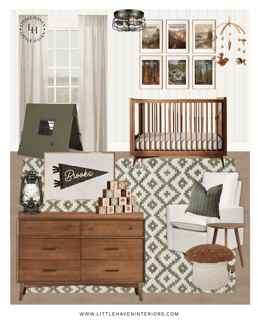 The palette leans into forest greens, walnut wood, creamy neutrals, and subtle black accents for contrast. I love the nostalgic nod to National Parks in the gallery wall, it sets the tone for a space that invites exploration and imagination. The crib has clean, modern lines and is Greenguard Gold certified. The dresser is one of my favorite mid-century-inspired finds that doesn’t skimp on storage.