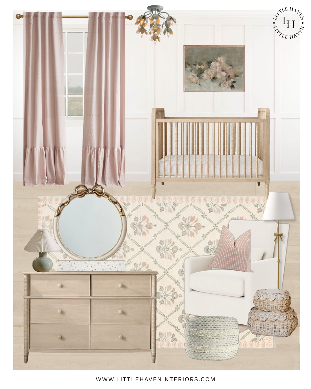 French country vintage-inspired baby girl's nursery room design. Sage greens, dusty roses and soft creams create a harmonious, floral-inspired color palette. Thoughtfully sourced with low-toxin, healthier, baby-safe products so you can have peace-of-mind they’re sleeping in a little haven as pure as they are. Keep scrolling to shop the links below!