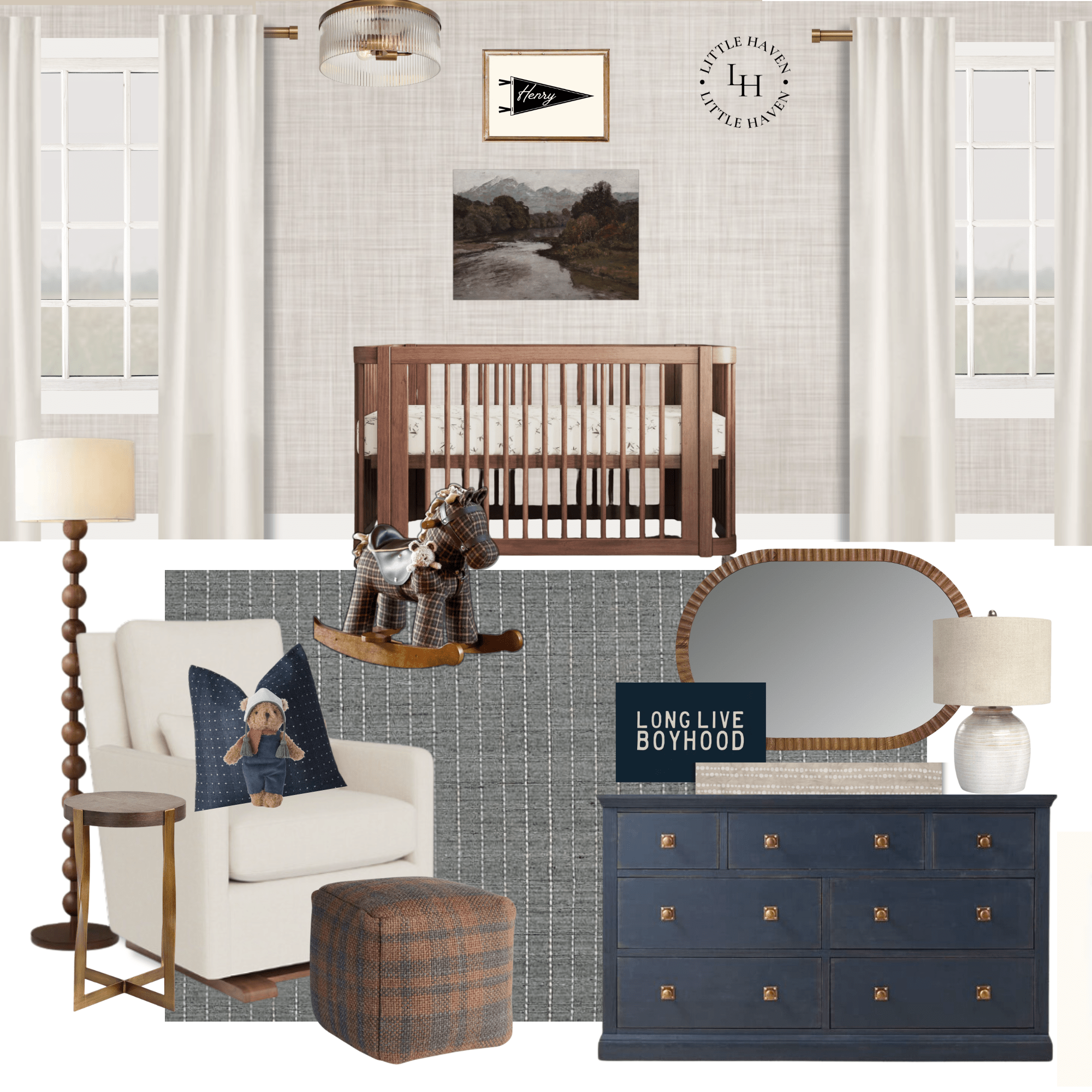 Crib // Mattress // Mattress Protector // Crib Sheets // Landscape Art // Pennant Name Art // Dresser // Mirror // Changing Pad // Changing Pad Cover // Boyhood Art // Lamp // Glider // Ottoman // Throw Pillow // Accent Table // Floor Lamp // Olive Tree // Rug // Rug Pad // Wallpaper // Trim Paint Color // Curtains // Blackout Shades // Curtain Rods // Ceiling Light