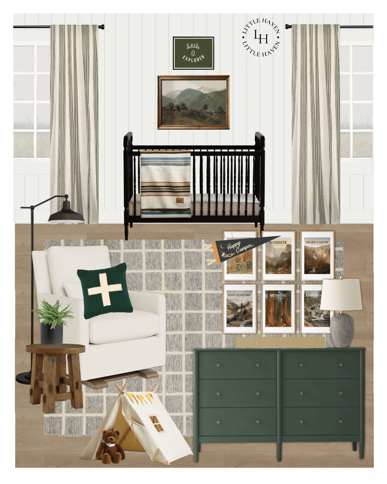 Crib // Mattress // Mattress Protector // Crib Sheets // Landscape Art // Little Explorer Art // Dresser // National Parks Art // Changing Pad // Changing Pad Cover // Gray Lamp // Glider // Play Camping Tent // Throw Pillow // Accent Table // Floor Lamp // Boston Fern // Rug // Rug Pad // Paint Color // Curtains // Blackout Shades // Curtain Rods // Happy Camper Pennant // Blanket