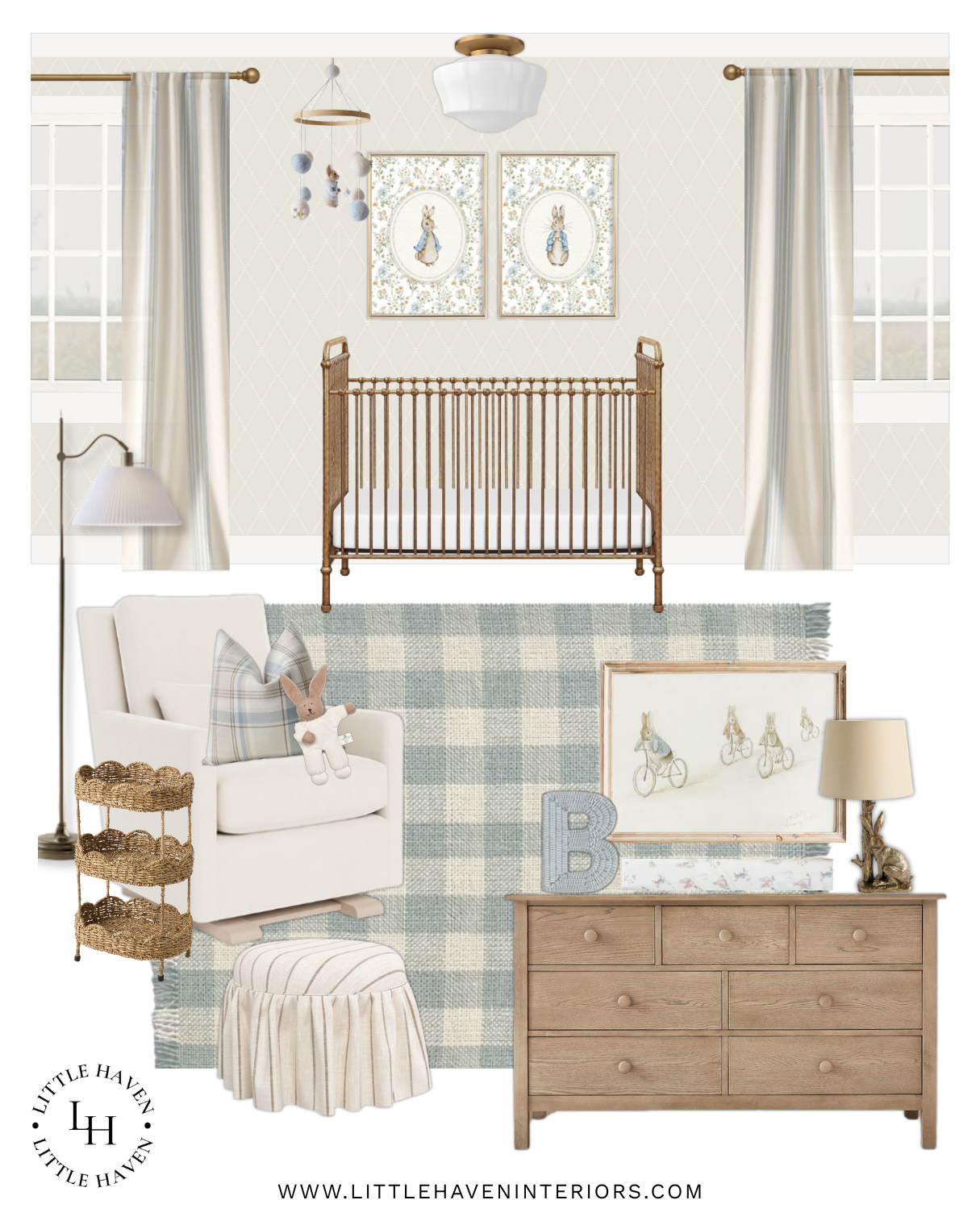 Crib // Mattress // Mattress Protector // Crib Sheets // Art Above Crib // Dresser // Art Above Dresser // Changing Pad // Changing Pad Cover // Woven Initial // Lamp // Peter Rabbit Art // Glider // Ottoman // Throw Pillow // Accent Table // Floor Lamp // Stuffed Rabbit // Rug // Rug Pad // Wallpaper // Trim Paint Color // Curtains // Blackout Shades // Curtain Rods // Ceiling Light